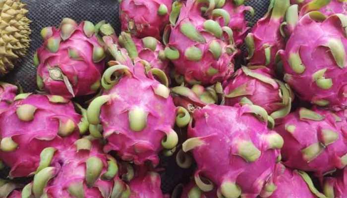 蛟龙果的外皮呈鲜红色,表面有细小的鳞片,看起来就像一条小龙的皮肤。果肉呈白色或淡黄色,质地细腻,口感清甜。果肉中含有丰富的黑芝麻状种子,这也是蛟龙果的一大特色。